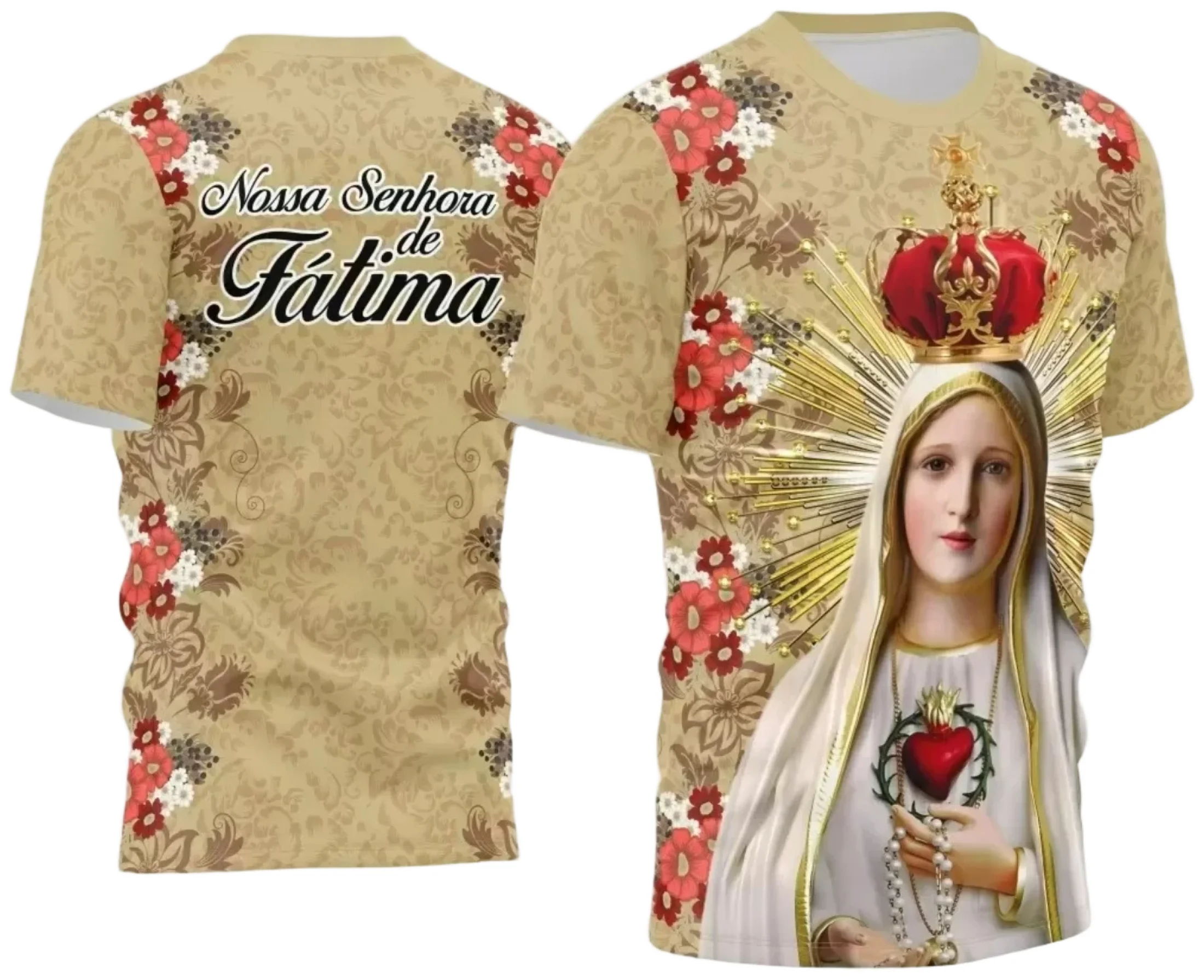 Transmita sua devoção de forma autêntica com a Arte Estampa Camisa Flores Vermelhas Religião Nossa Senhora de Fátima 2024. Com detalhes delicados e uma reverência à Virgem Maria, esta arte é perfeita para aqueles que desejam expressar sua fé de maneira significativa.