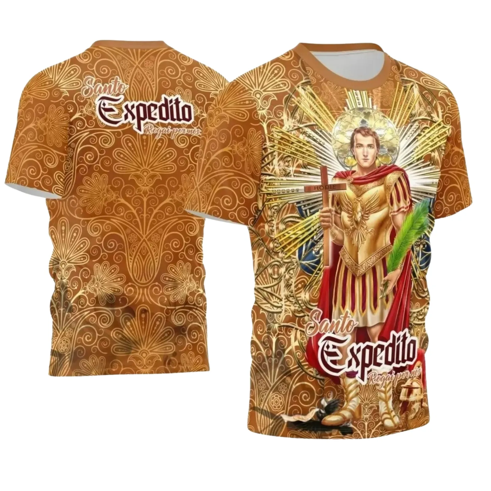 Esta camisa não só captura a essência espiritual de Santo Expedito, mas também reflete uma abordagem moderna ao vestuário religioso, combinando cores vibrantes e elementos gráficos contemporâneos.