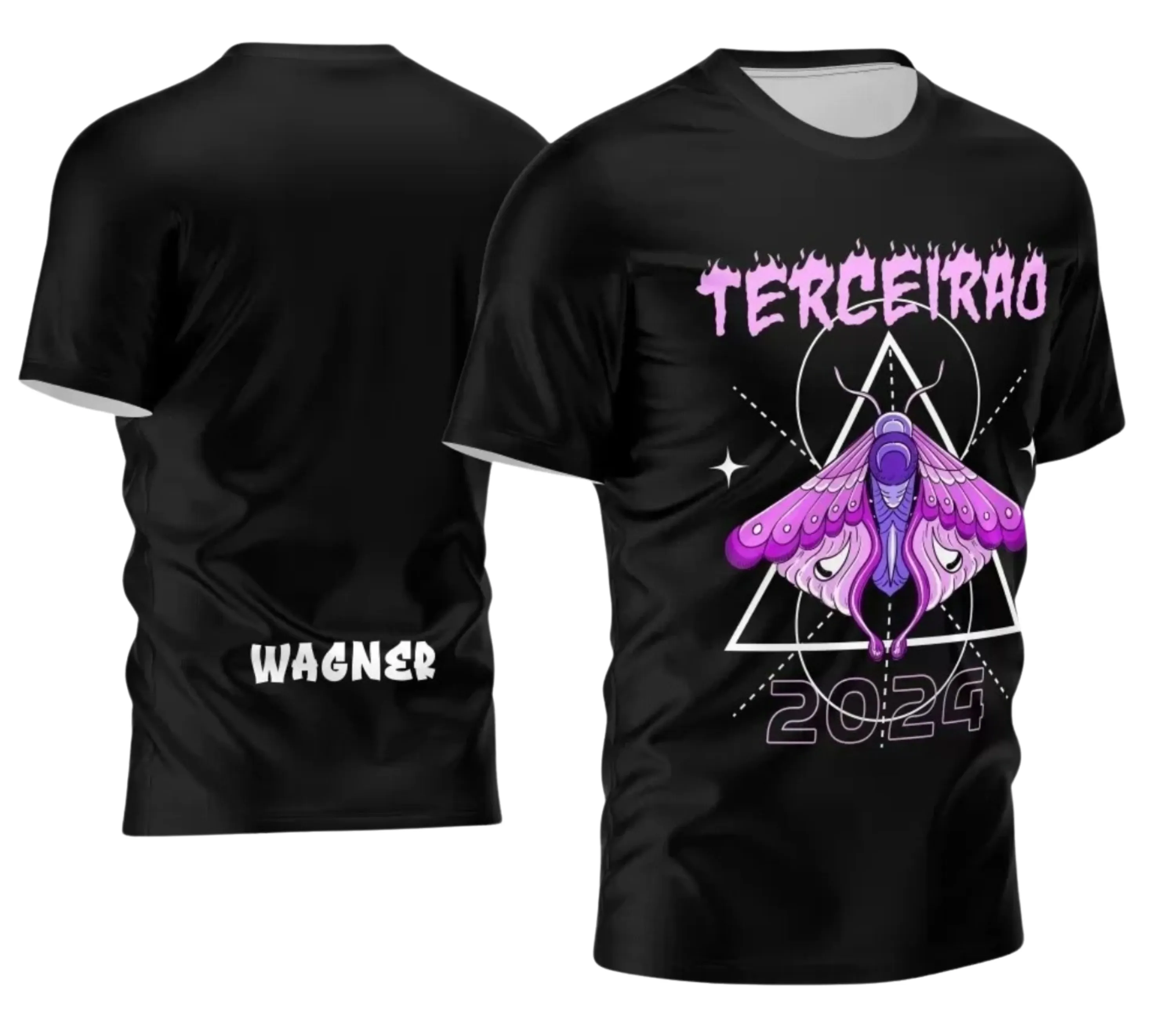 A paleta de cores escolhida — um vibrante roxo contrastando com o preto — adiciona um toque de energia e modernidade ao design. O ano 2024 está integrado à arte de maneira proeminente, solidificando a importância desse período na vida dos alunos. Cada camisa pode ser personalizada com o nome do estudante, como demonstrado pelo WAGNER na parte inferior, tornando cada peça única para o seu proprietário.