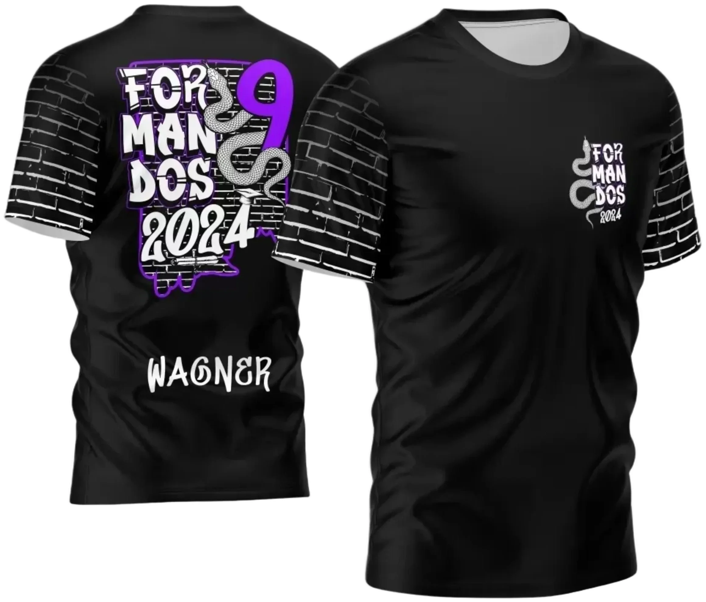 Com detalhes vibrantes em roxo sobre um fundo preto elegante, o design da camisa é destacado por um grande 9, interligando-se aos FORMANDOS 2024, um simbolismo do fechamento de um ciclo significativo. As mangas contam com um padrão de listras, oferecendo um contraste visual marcante que complementa o corpo da camisa. A possibilidade de adicionar o nome de cada estudante garante um toque pessoal e único.