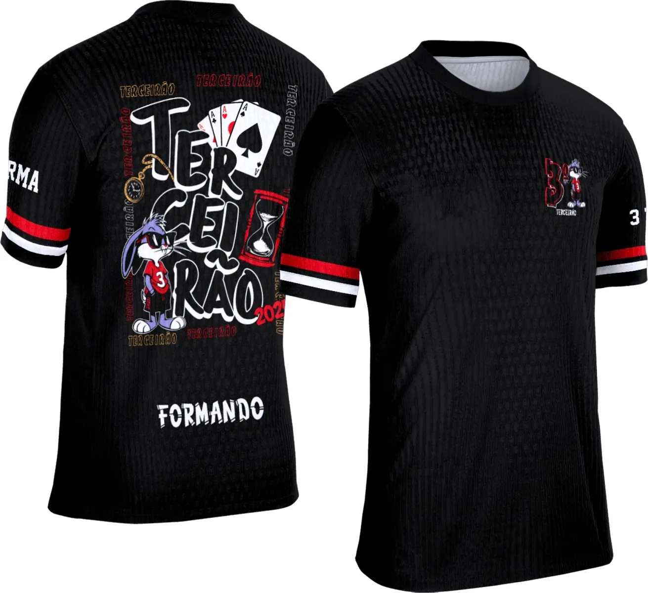 Imagine a animação de um grupo de estudantes que está prestes a encerrar uma etapa importante da vida escolar, o Terceirão. Para marcar esse momento, eles decidem criar algo único: uma camisa personalizada que represente o espírito da turma. A ideia de um mascote divertido, um coelho animado, surge após várias conversas e risadas. O coelho, personagem alegre e cheio de energia, reflete exatamente a vibe do grupo. Com a arte pronta, a expectativa só aumenta. No dia do evento, ver todos usando a mesma camisa, com o logo no peito e a estampa grande nas costas, criou um sentimento de união e identificação que ficou para sempre na memória.O que você recebe