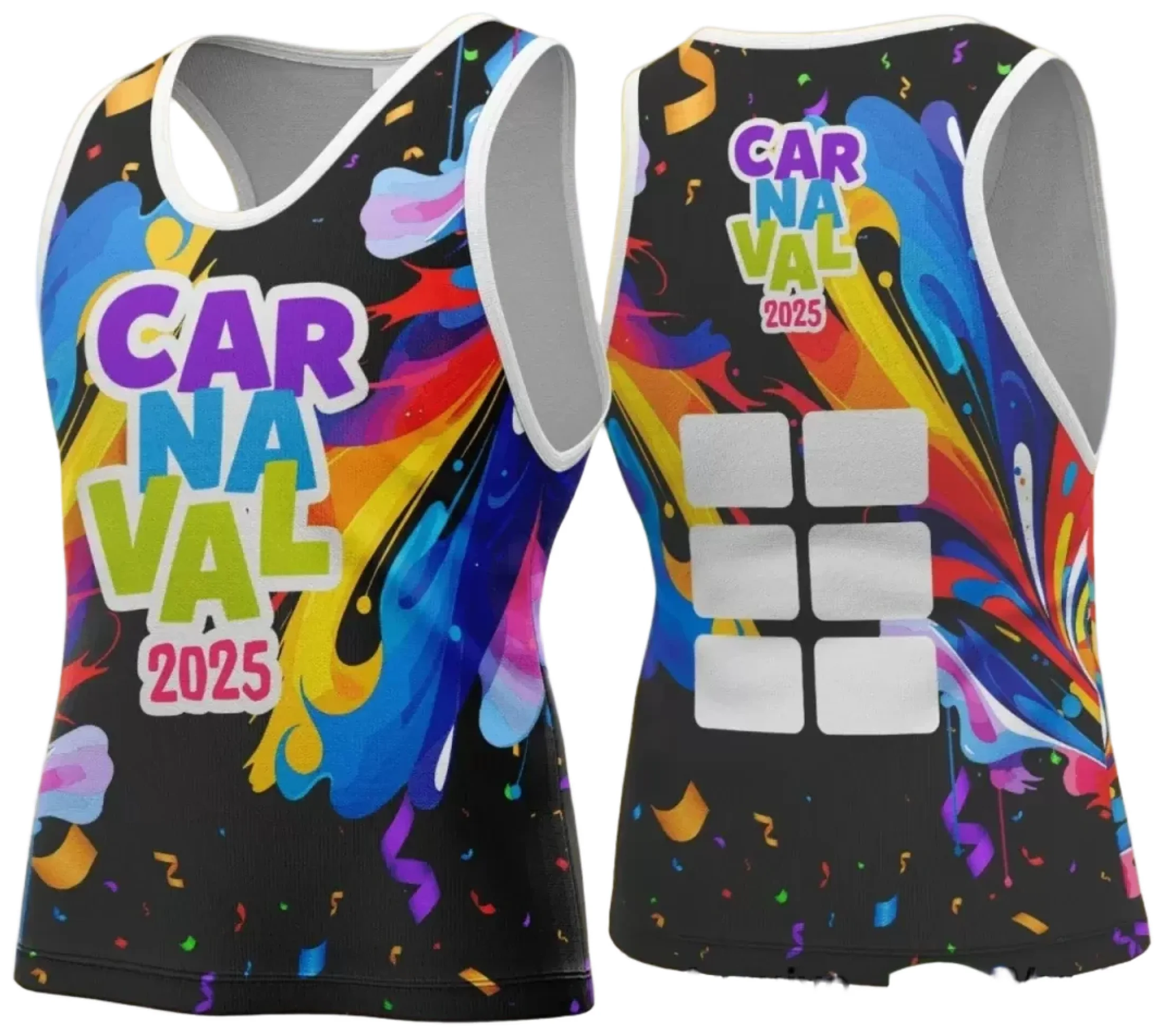 Prepare-se para brilhar neste Carnaval com uma arte pensada para transformar camisetas comuns em peças incríveis e personalizadas! Este modelo traz um design moderno, que destaca o logo no peito e uma estampa ampla nas costas, ideal para blocos e eventos de folia.