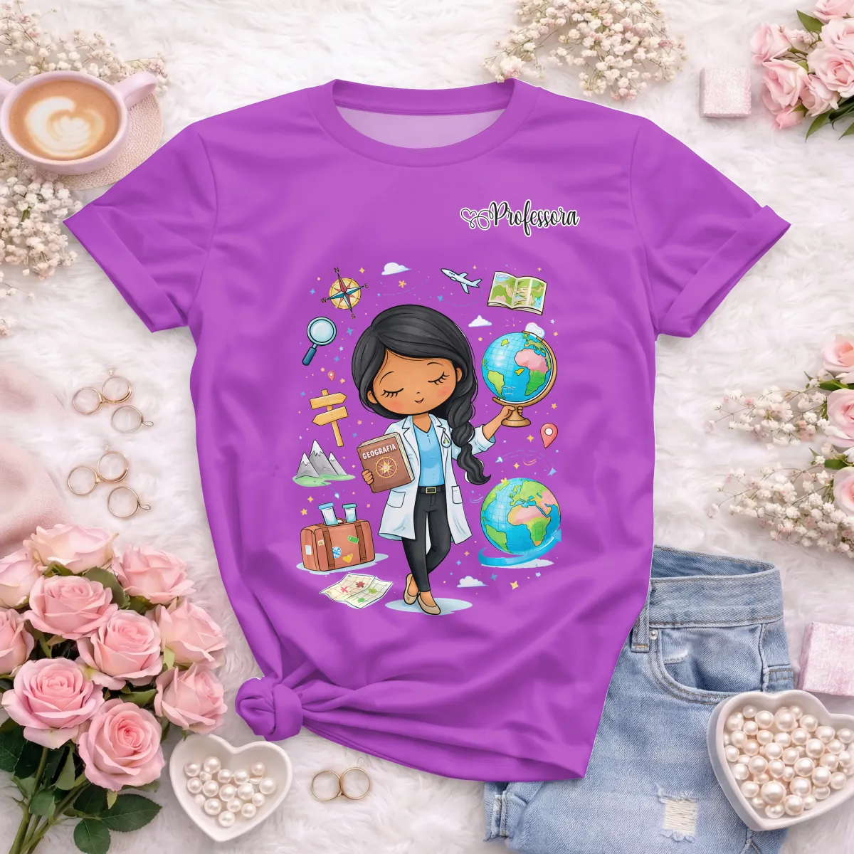 Camiseta de Professora confortável para o dia a dia, ideal para rotina escolar e uso profissional. Desenvolvida para educadoras que buscam bem-estar, praticidade e um visual leve e moderno em sala de aula e fora dela. Criação Doces Desenhos.