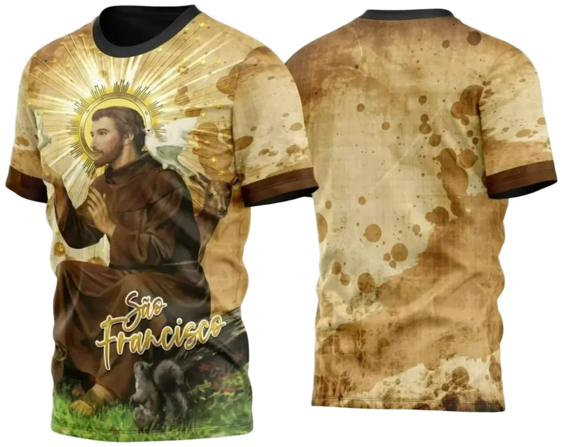 Celebre a vida e os ensinamentos de São Francisco de Assis com o Template Camisa Religião - São Francisco de Assis. Ideal para os devotos e admiradores das virtudes deste santo, o design captura sua humildade e seu profundo amor por todas as criaturas. Esta arte vetorial foi criada para sublimação em camisas, oferecendo uma forma especial de expressar sua fé e admiração pelo patrono dos animais e do meio ambiente.